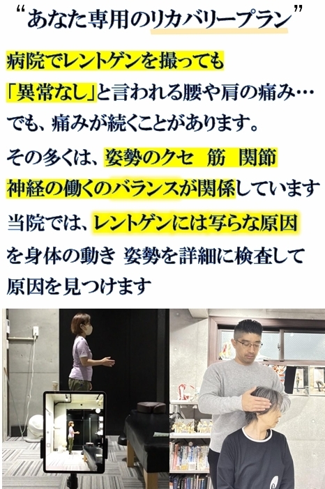 安静にしたり、痛み止めを服用したりする事でカラダの不調が一時的に良くなる方もごく少数いらっしゃいますが、ほとんどの場合は、病院を受診して検査を受けても「骨に異常はありません!」「年によるモノですね!」「生活習慣や仕事のせい!」など、慢性的なカラダの問題に対して明確な問題点が得られないことが多いように思います。