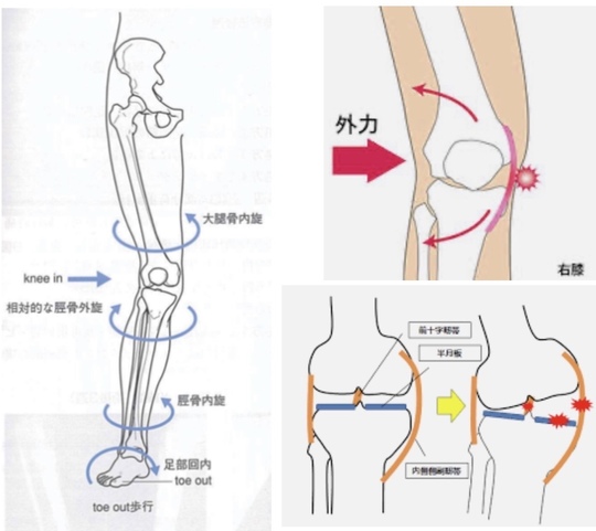 膝が内側に入ると膝関節にねじれが生じ、剪断力が加わります。