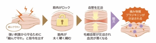 筋肉がコルと痛みを発生させる物質「ブラジキニン」が分泌されます。