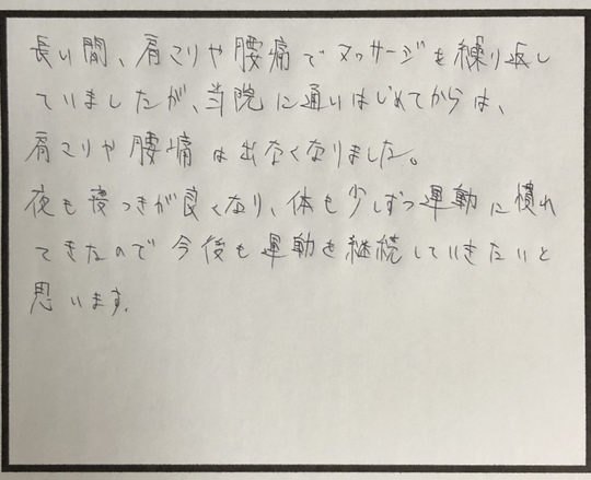 今後は腰痛の方も改善されればと期待しています。