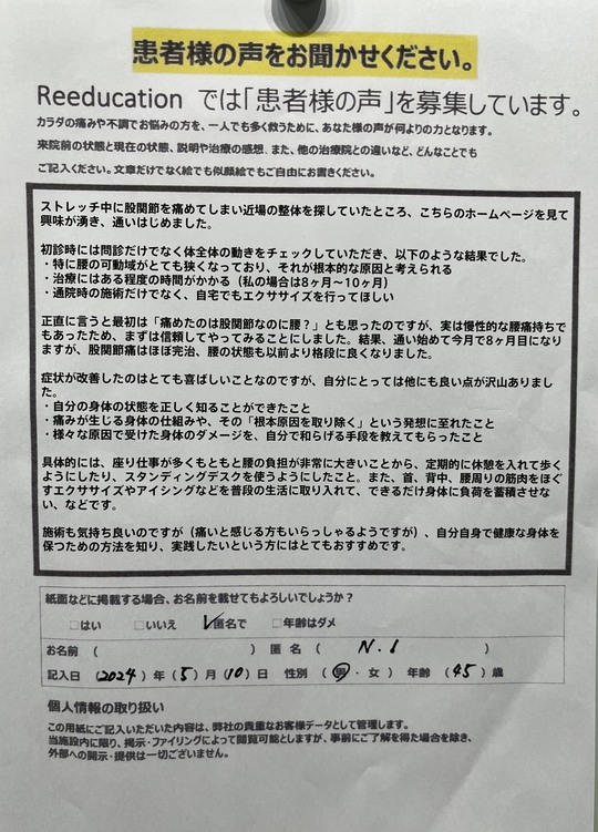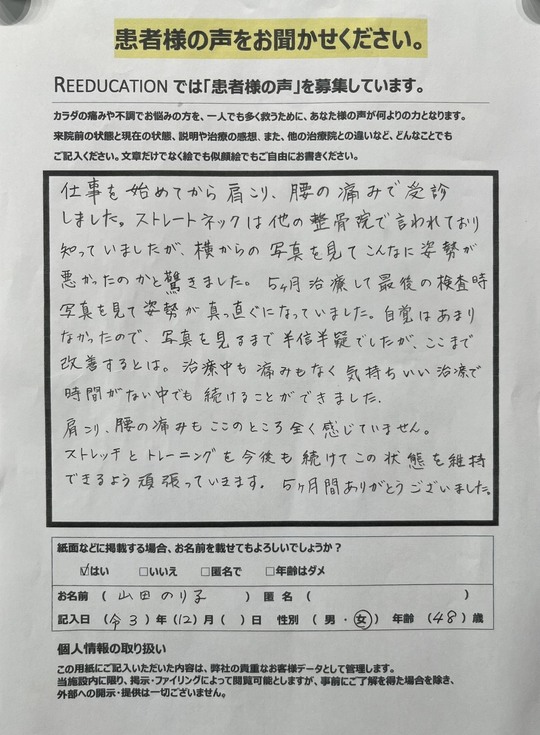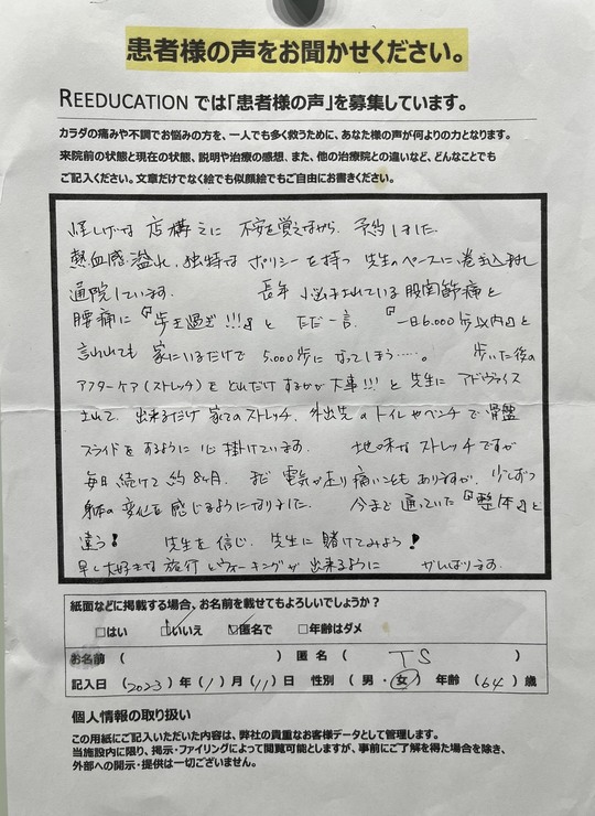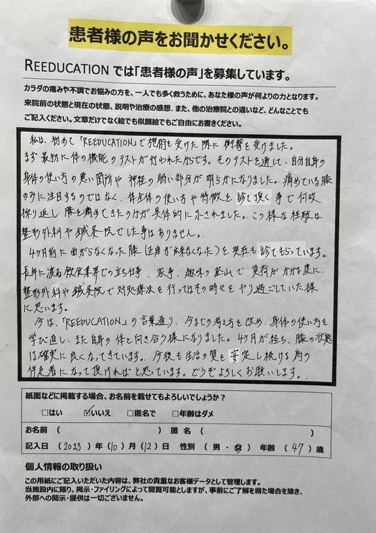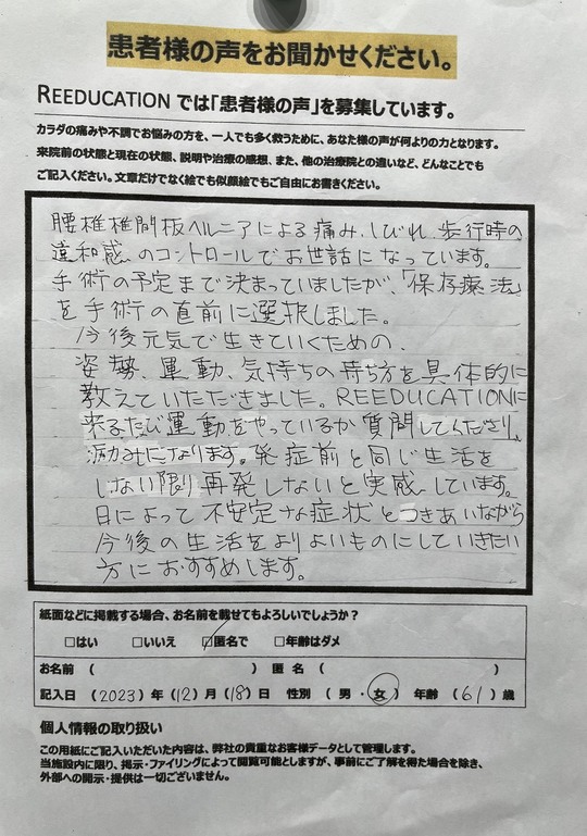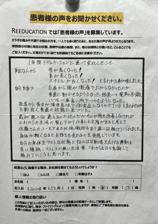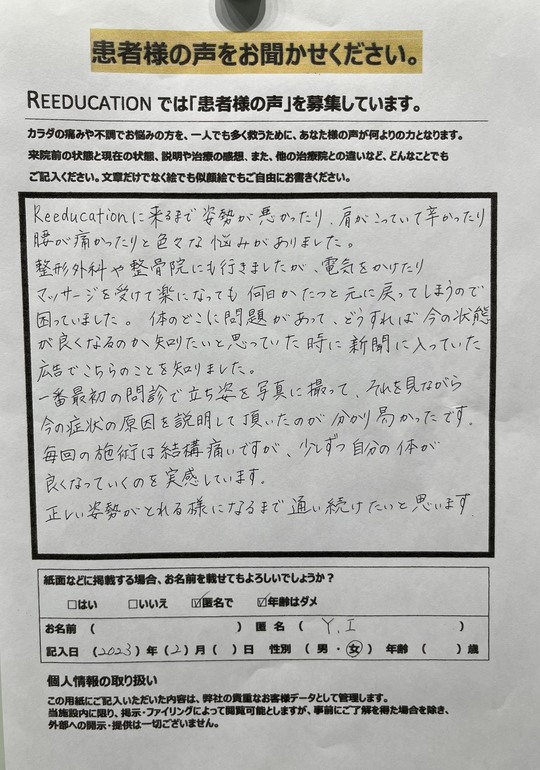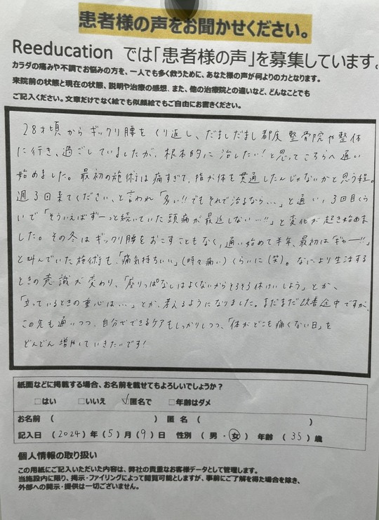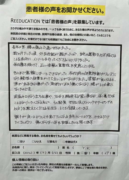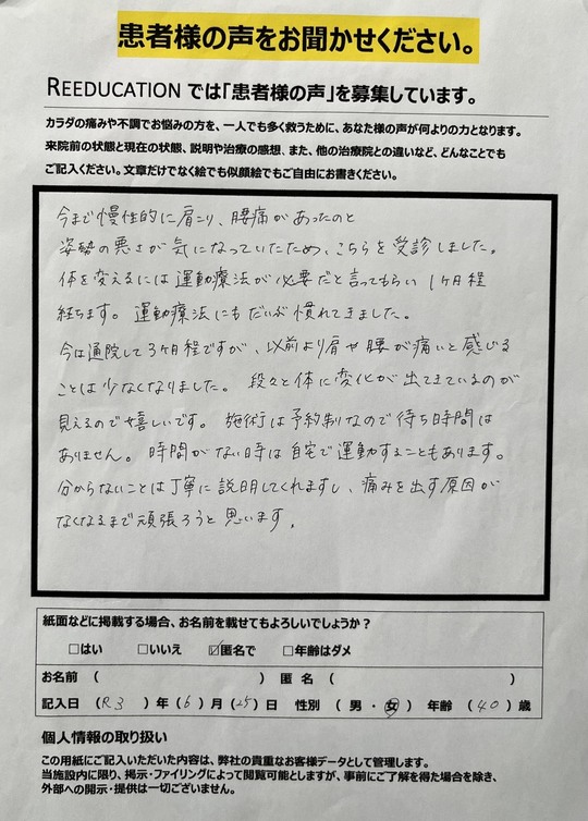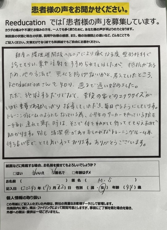 Reeducationに通っていただいているお客様よりいただいた