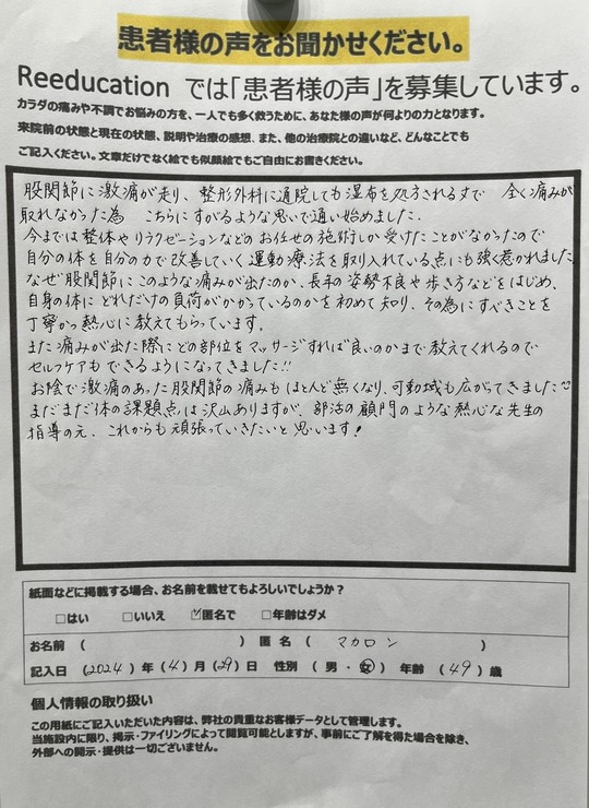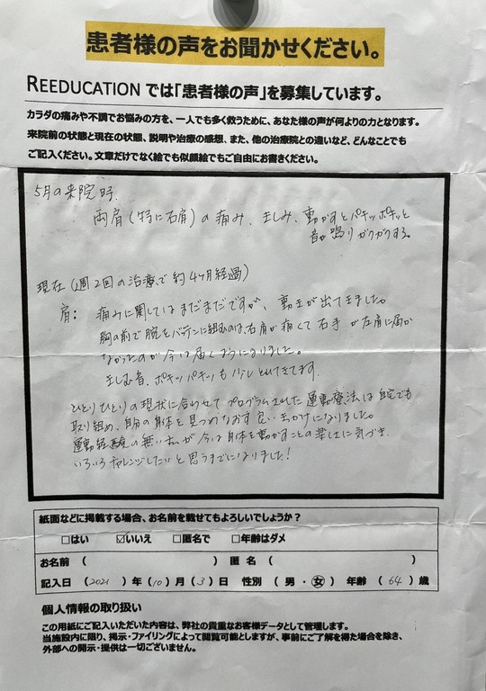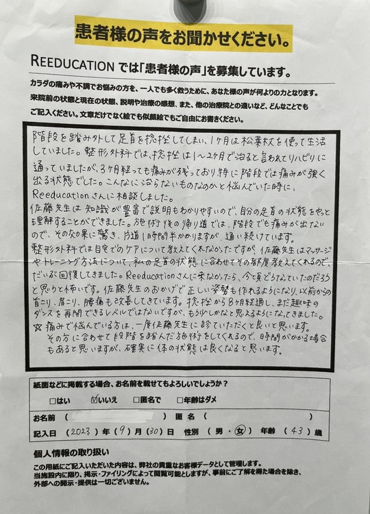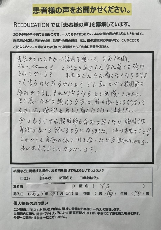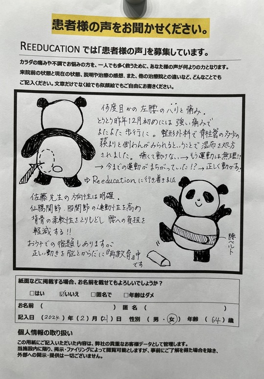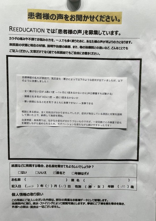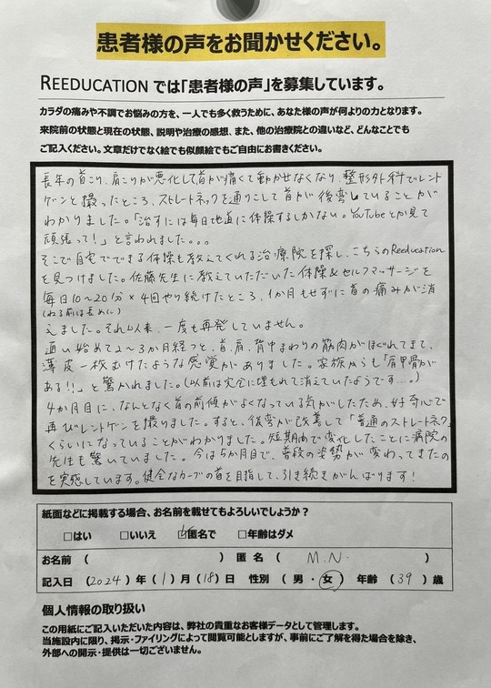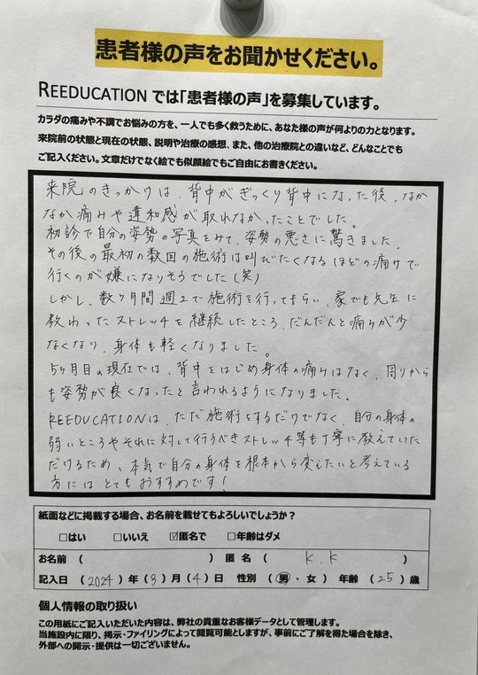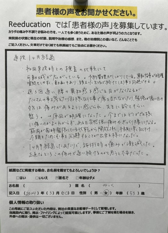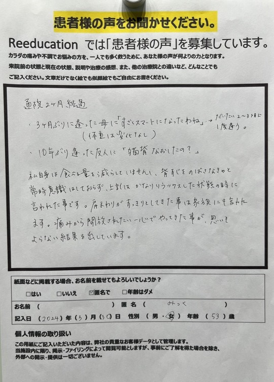 Reeducationに通っていただいているお客様よりいただいた