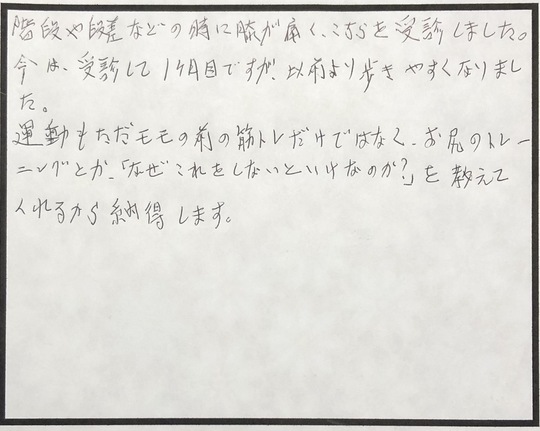 4か月前に曲がらなくなった膝(正座がデキなくなった)を現在も診てもらっています。長年にわたる飲食業界での立ち仕事、家事、趣味の登山で負担がかかるたびに、整形外科や鍼灸院で対処療法を行っては、その時々をやり過ごしていたように思います。