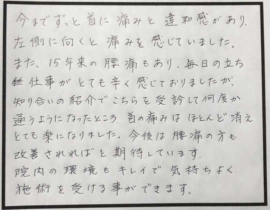 今までずっと首に痛みと違和感があり、左を向くと痛みを感じていました。また、15年来の腰痛もあり、毎日の立ち仕事がとてもつらく感じていましたが、知り合いの紹介でこちらを受診して何度か通うようになったところ、首の痛みはほとんど消えとても楽になりました。